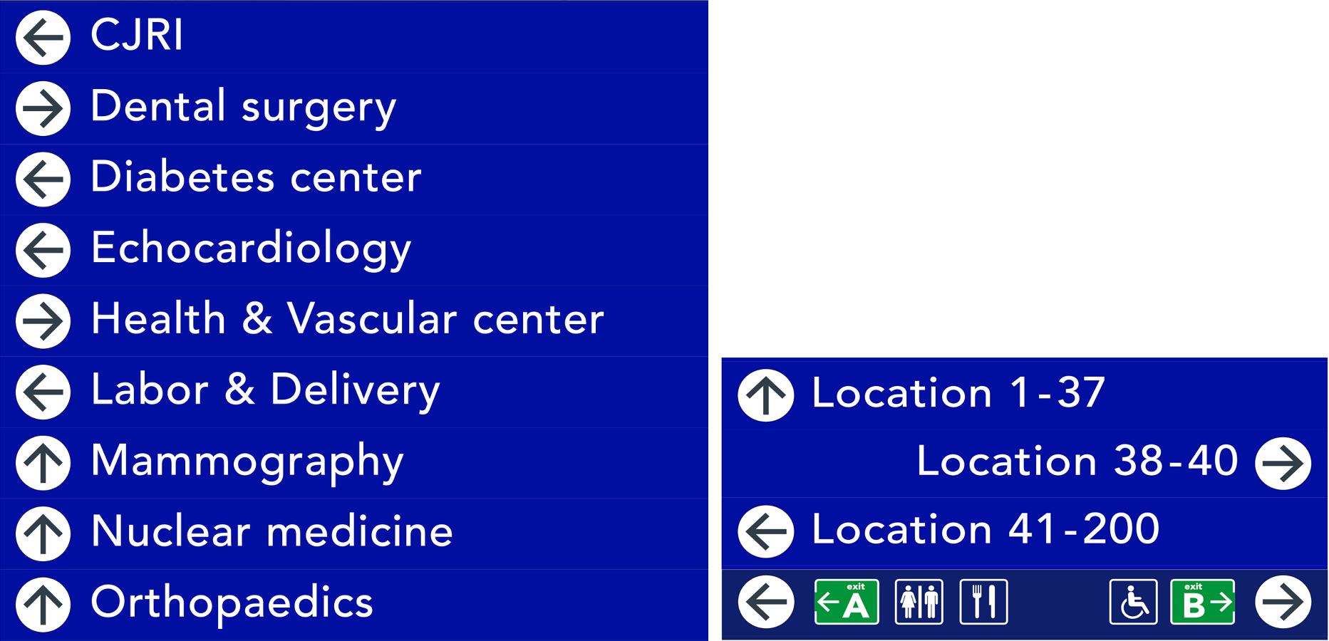 But that’s a challenge when many acute care hospitals exceed a million square feet and may support 50, 75, or 100+ clinical destinations. At these scales, traditional text-based lists can become visual noise.